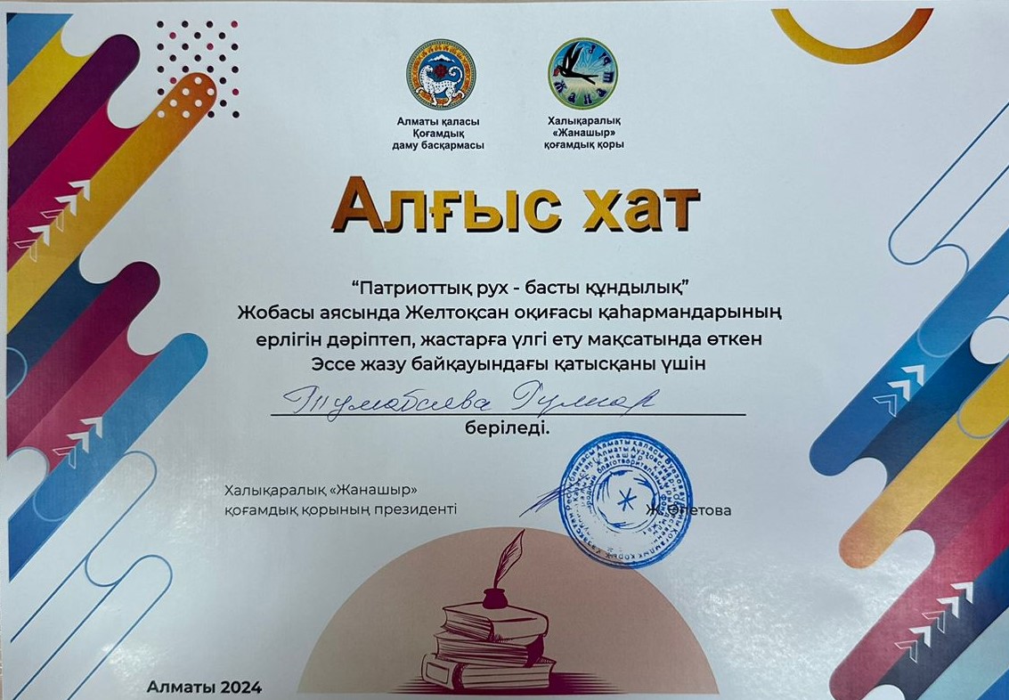 20 ноябрь 2024 0 1 2 3 4 5 "Патриоттық рух — басты құндылық" жобасы аясында! "Патриоттық рух — басты құндылық" жобасы аясында!Желтоқсан оқиғасы — қазақ халқының ерлігін, патриоттық рухын дәлелдеген тарихи кезең. Бұл оқиға еліміздің тәуелсіздігі мен болашағы үшін күрескен жастардың қайсарлығы мен батылдығының көрінісі.Жастарды осы рухта тәрбиелеу мақсатында ұйымдастырылған Эссе жазу байқауында үздік шығарманы жазған №10 мектеп-интернатының 8 "А" сынып оқушысы Берікұлы Абзал марапатталды! 🎉Құттықтаймыз, Абзал! Болашақта да өз еліңнің патриоты бола бер!Жетекшісі: Тумабаева Гульнар Капсаметовна