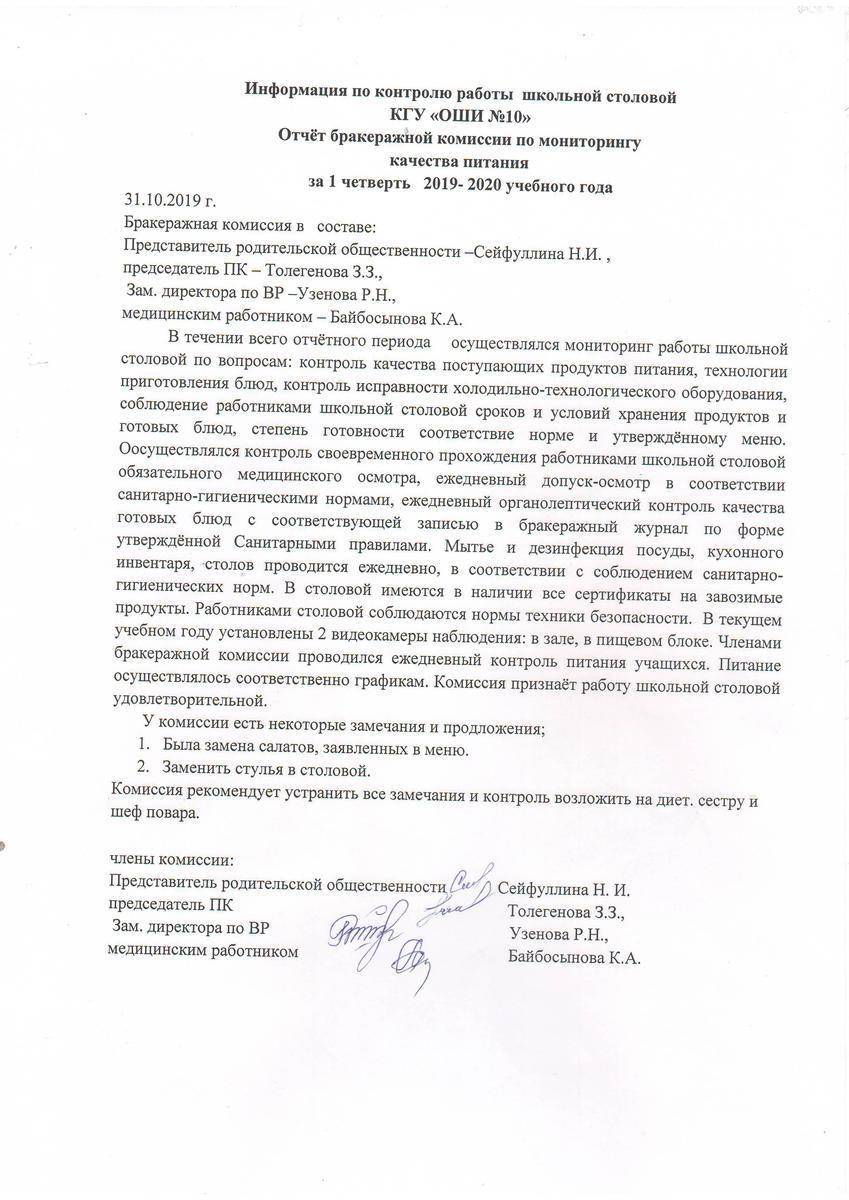 » Отчет бракеражной комиссии по мониторингу качества питания 31.10.2019