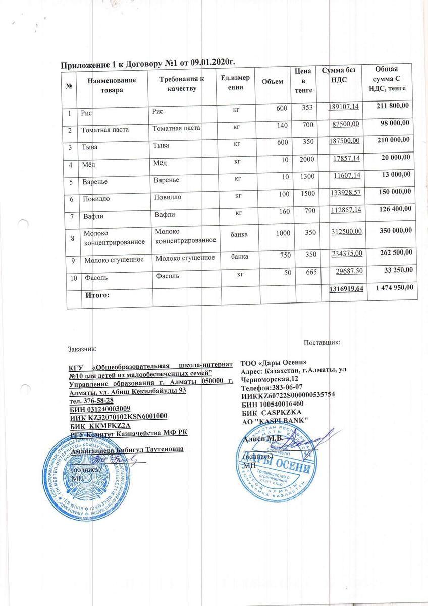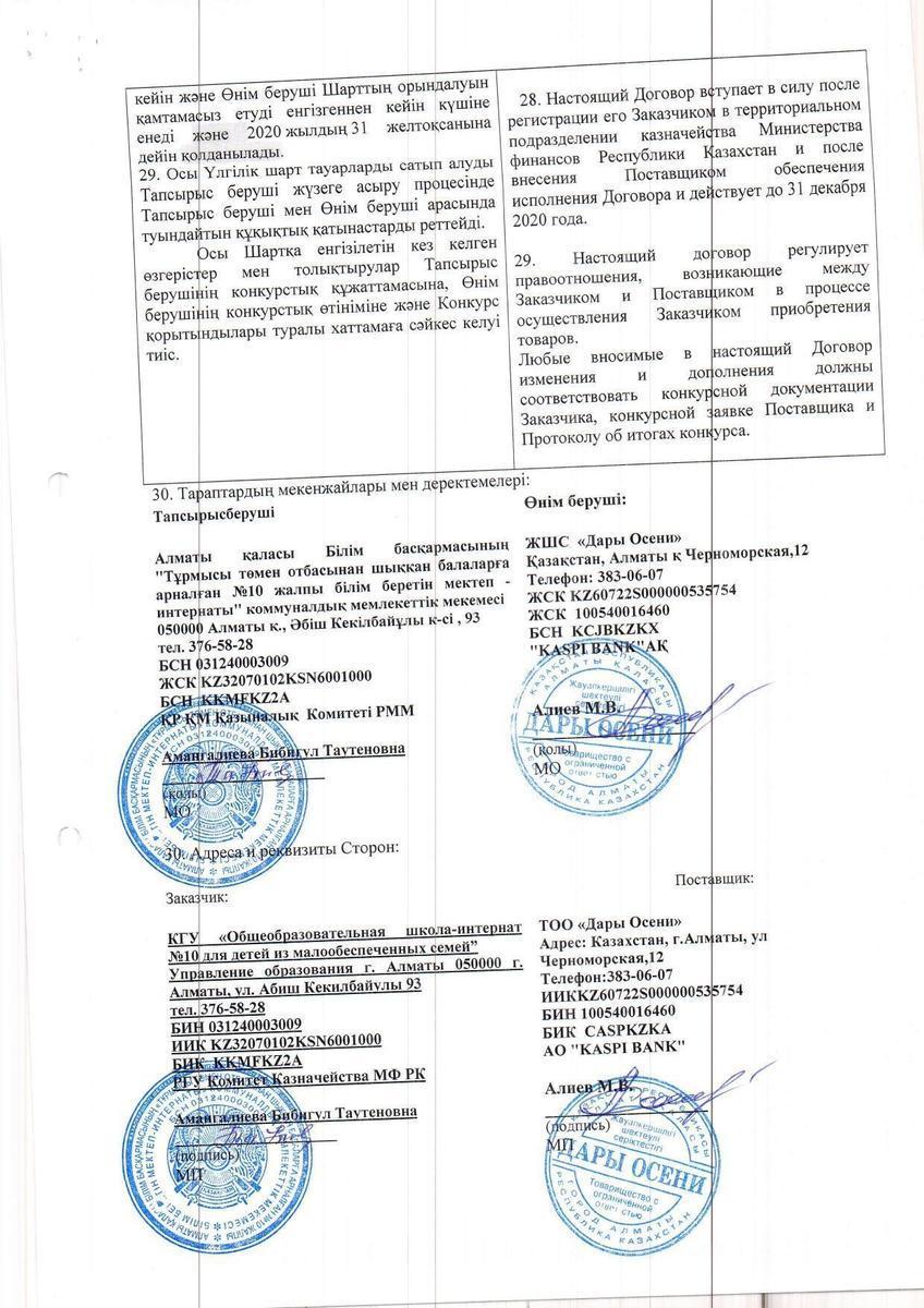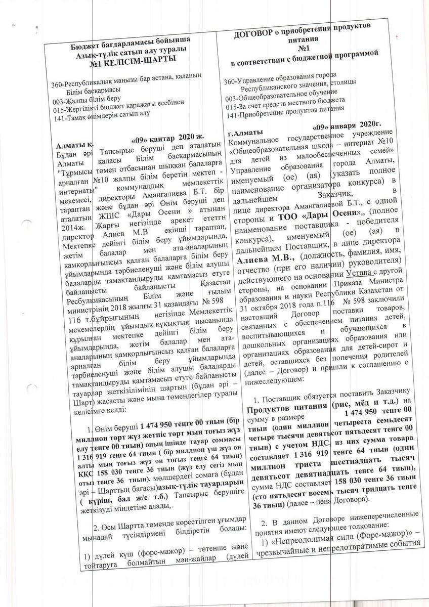 » Договор ТОО "Дары Осени" на 2020 г