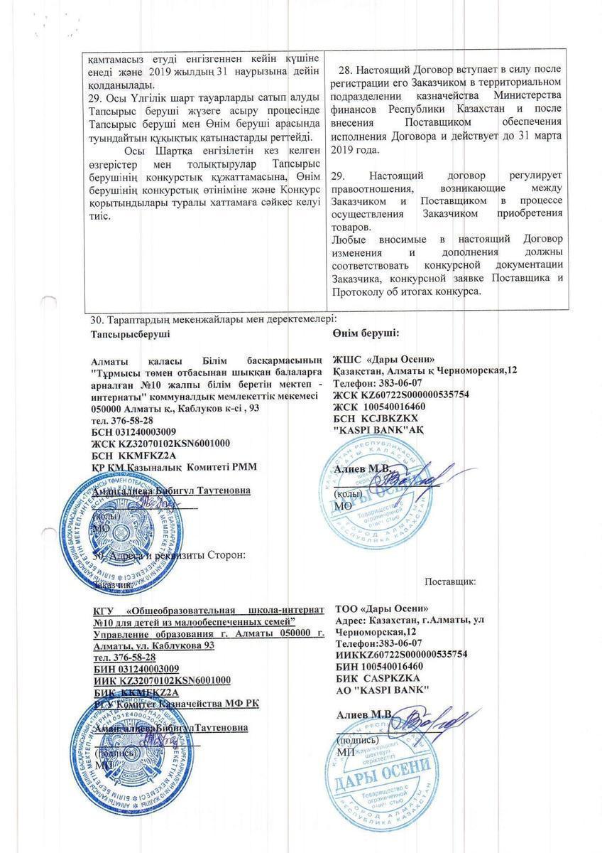 Договор ТОО "Дары Осени" 2019